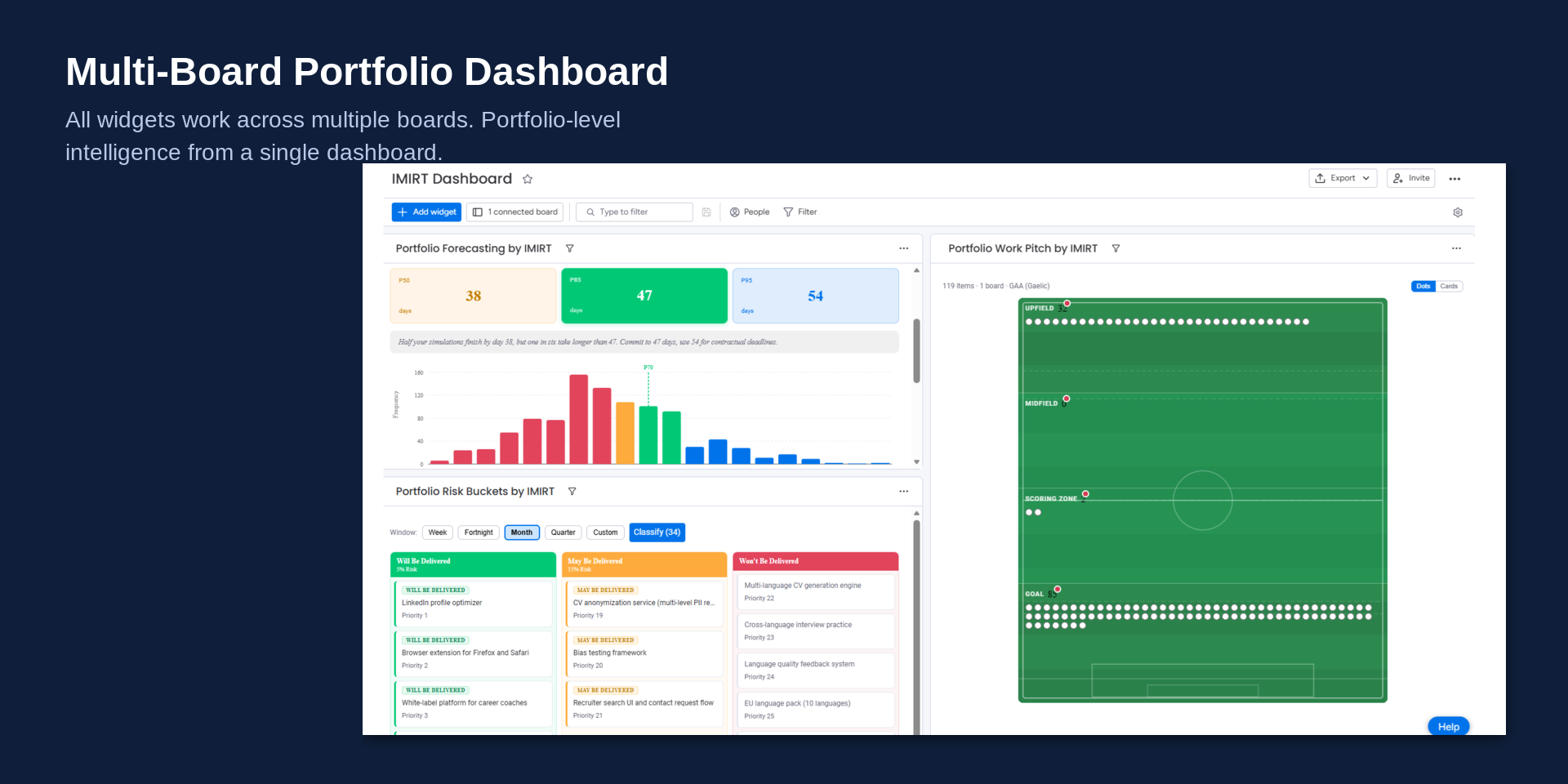 "description": "<p><strong>Delivery Intelligence by IMIRT</strong> uses Monte Carlo simulation on your actual <a href=\"http://monday.com/\" rel=\"noopener noreferrer\" target=\"_blank\">monday.com</a> board history to give you probabilistic delivery forecasts. Built for project managers, delivery leads, and engineering teams who need data-driven answers instead of gut-feel estimates.</p><p>What you get:</p><p>- Probabilistic Forecasting — Four forecast types (How Long, When, How Much, How Likely) powered by your historical completion rates. Colour-coded percentile cards and histogram charts show risk at a glance.</p><p>- Risk Buckets — Items automatically classified into Will, May, and At Risk columns based on delivery confidence. Stop guessing which items will land.</p><p>- Expected Delivery (xD) — Compare what your team should have delivered against what they actually delivered. Spot drift by week 2, not end of quarter.</p><p>- Shot Clock — Time-in-state tracking against your board's historical average, with coaching messages before items stall.</p><p>- Find The Reds — Systemic bottleneck detection. Toggle between Acute (items stalled now) and Structural (states that consistently slow everything down).</p><p>- Stack The Odds — Dependency-aware delivery intelligence. See which items are blocked, blocking others, or at risk due to upstream dependencies.</p><p>- The Work Pitch — Visualise your workflow as a playing field with soccer, GAA, or other sports pitch themes.</p><p>- Multi-Board Aggregation — All widgets work across multiple boards for portfolio-level intelligence.</p><p><br></p><p>Problems we solve:</p><p>- Engineering estimates miss targets by 30-50% — we replace guesswork with probability</p><p>- No visibility into which items are actually at risk — we classify risk automatically</p><p>- Bottlenecks discovered too late — we detect stalls and structural issues early</p><p><br></p><p>Use cases:</p><p>- Sprint planning: \"Can we realistically finish these 12 items by March 15th?\"</p><p>- Stakeholder updates: \"There's an 85% chance we deliver by the 22nd\"</p><p>- Continuous improvement: \"Items spend 3x longer in Code Review than any other state\"</p><p>About IMIRT: Built in Newry and Dublin, Ireland by delivery practitioners who use it daily. IMIRT is Irish for \"sport\" — bringing the discipline of data-driven performance analysis to software delivery. Free for 2 boards.</p><p>Get in touch: email us at <a href=\"mailto:support@whatifwe.ai\" rel=\"noopener noreferrer\" target=\"_blank\">support@whatifwe.ai</a></p>",